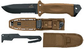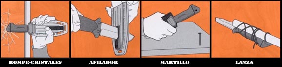 Survival Knife 10 "(254 mm) tested in the harshest conditions. Has blade with black anti-reflective coating. Can be used to cut the skin of the fuselage, cut a seat belt, break glass. Besides this survival knife is capable of cutting firewood and building shelter. You can even tie a stick to build a spear. For this purpose, the handle includes a series of holes that secure it to the post. Multipurpose: hammer, spear tip glass break, integrated sharpener.